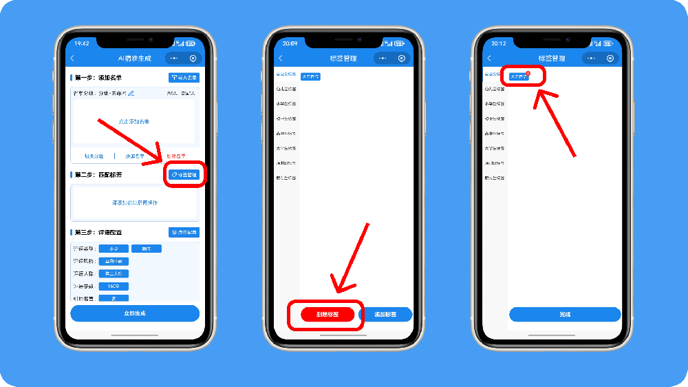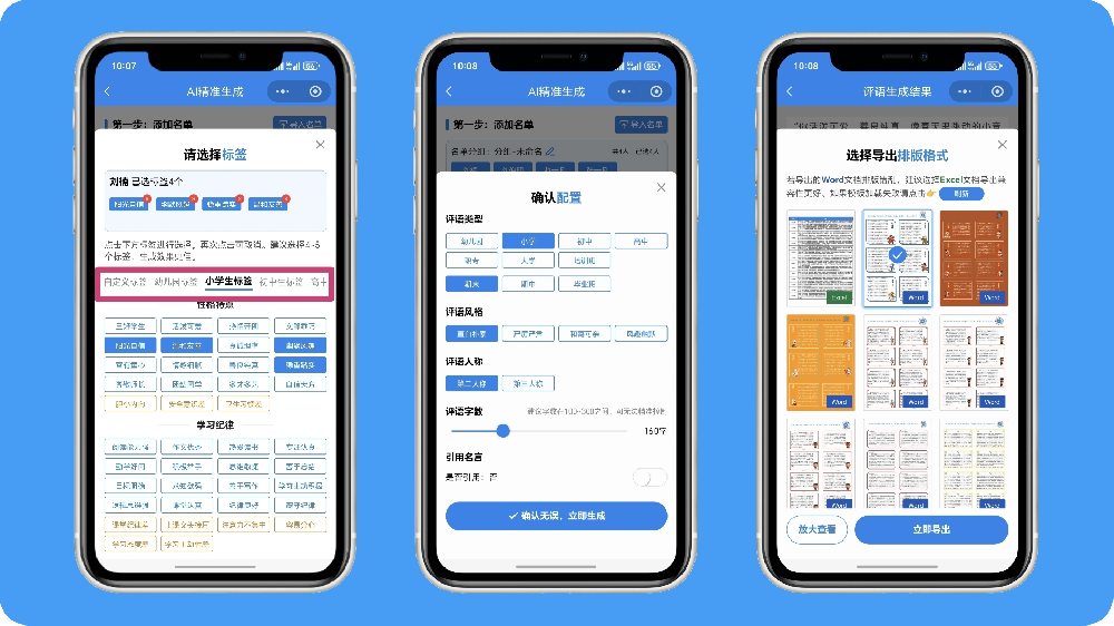 该模块可根据学生标签,由AI为学生生成符合学生标签的期末评语。录入学生名单后,需要为每个学生匹配标签,内置多类型评语标签,···