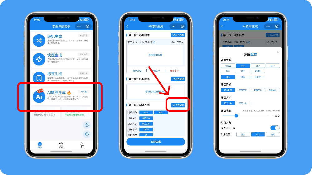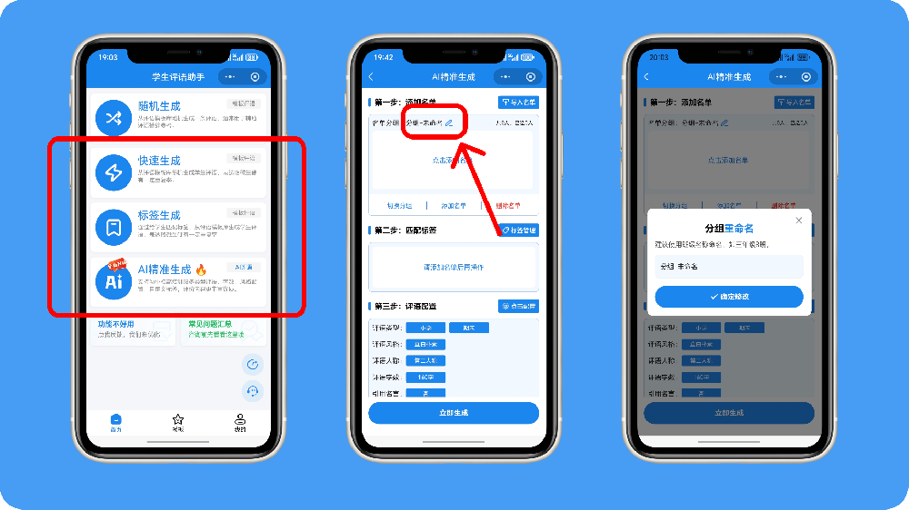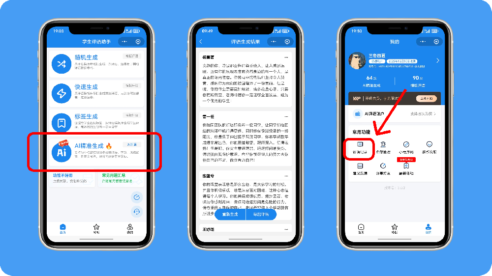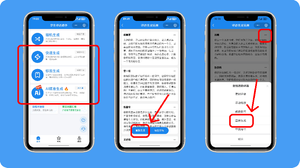 在快速生成、标签生成或Ai精准生成的评语生成结果页面,点击底部按钮“重新生成”按钮,即可批量重新生成学生评语,或者点击每条···